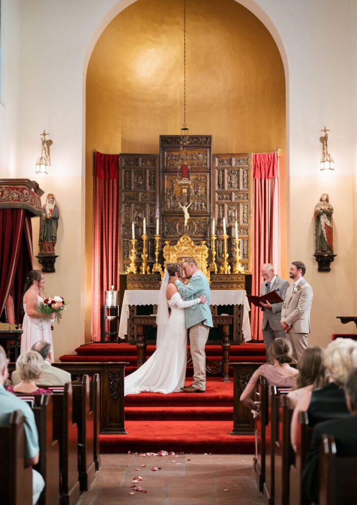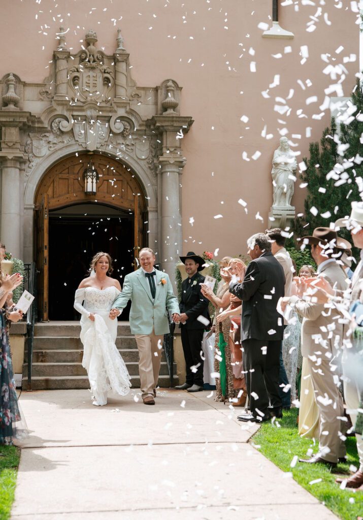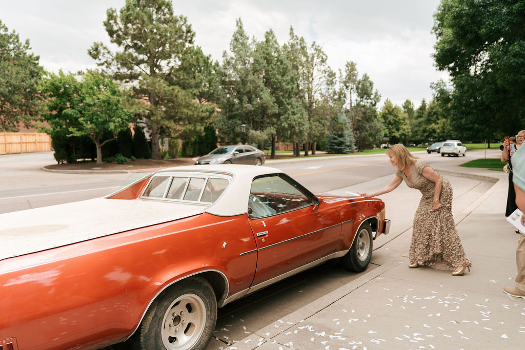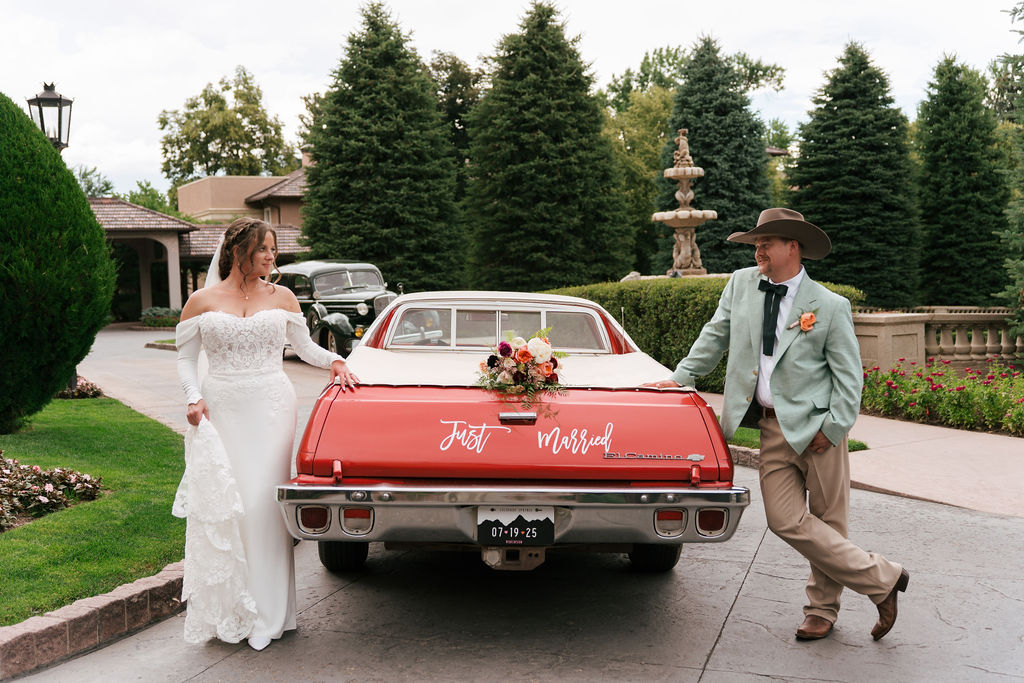 The ceremony took place inside the chapel, where family and friends filled the space completely. It felt close and meaningful, with everyone fully present as Amber and Jay exchanged vows. After they were pronounced married, guests gathered outside the church for a joyful confetti exit. Amber and Jay drove away in Jay’s cherry red El Camino, complete with a custom license plate featuring their wedding date, which made for an unforgettable send off.