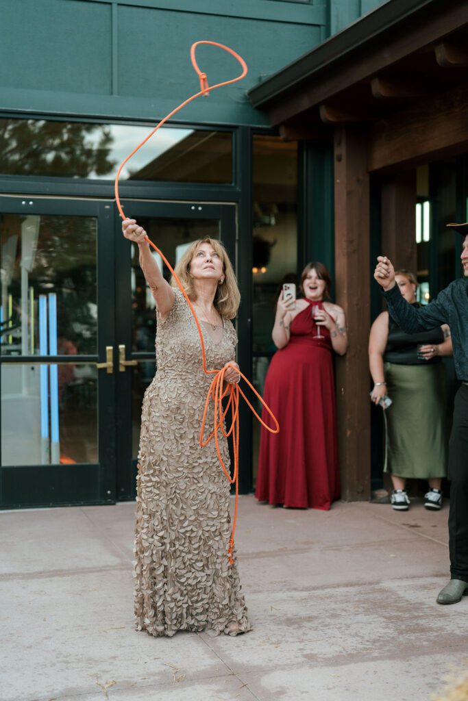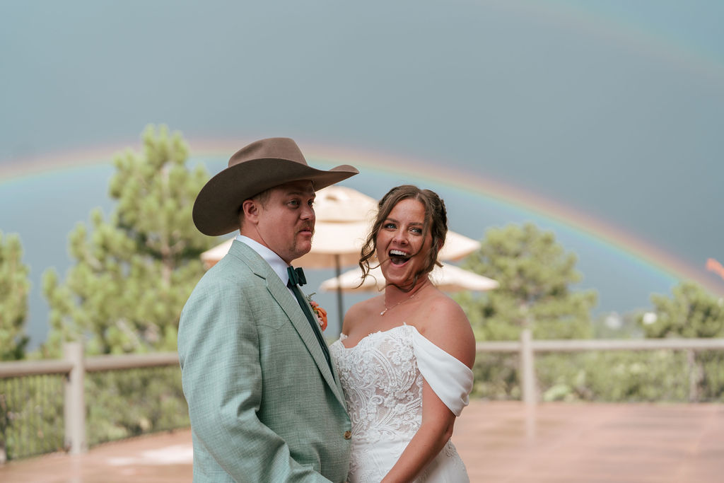 From there, everyone headed up to Cheyenne Lodge at The Broadmoor, where cocktail hour kicked off with incredible views of the surrounding landscape. Guests played mini golf, tried their hand at lasso practice, and soaked in the scenery. As if the timing could not have been better, a full rainbow appeared just for Amber and Jay, stretching across the sky and stopping everyone in their tracks.