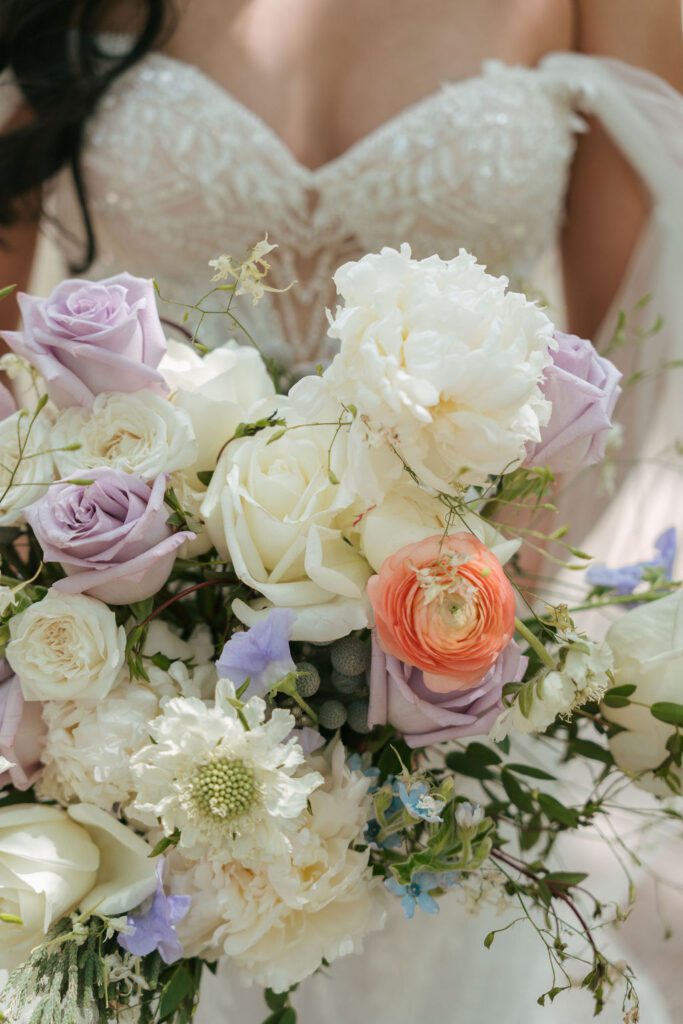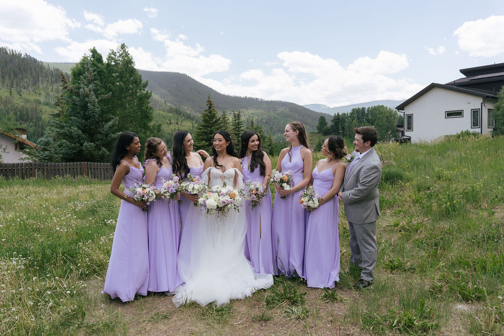 The morning began with Cindy and Andrew getting ready separately at a nearby hotel in Vail. Cindy’s space was calm and light-filled, setting the tone for a day that felt centered and present. Her details reflected a soft, romantic palette with lavender tones, white florals, and subtle pops of peach that carried throughout the entire wedding design.