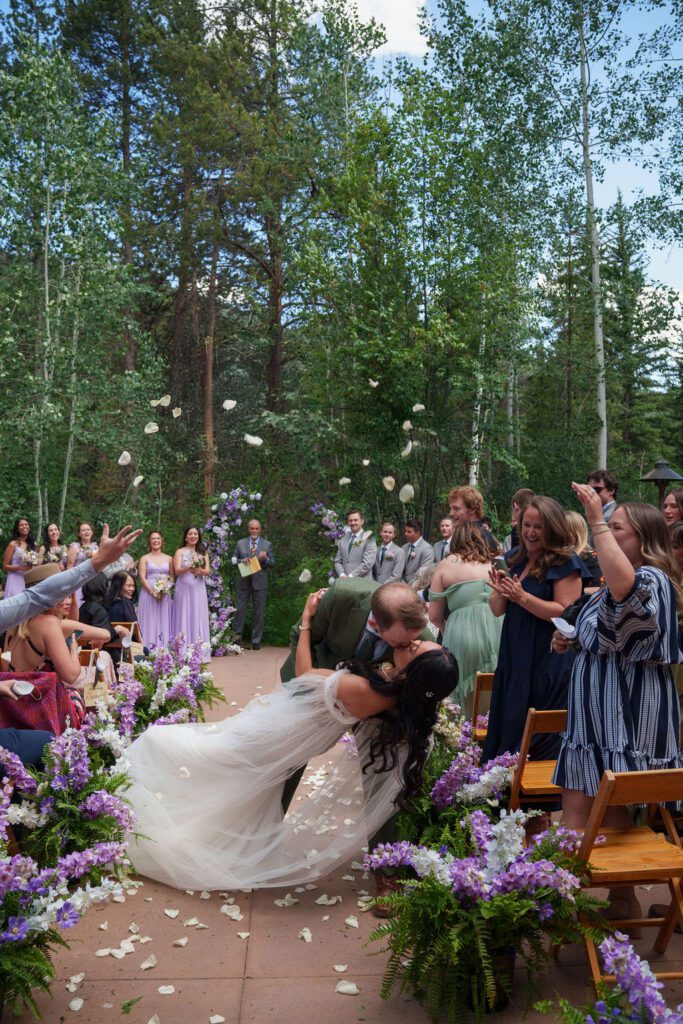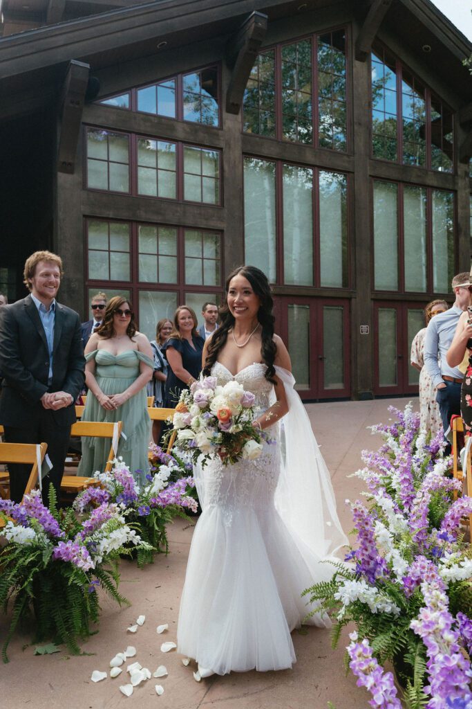 The ceremony took place at the Donovan Pavilion in Vail, Colorado, with guests seated beneath towering windows and surrounded by forest views. The ceremony design carried the same soft lavender florals seen earlier in the day, lining the aisle with lush arrangements that added texture without feeling overly styled.
