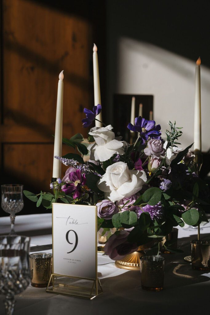 The reception design at Donovan Pavilion balanced elegance with warmth. Tables were styled with low floral arrangements, candlelight, and soft purple accents that reflected the overall color palette. As the sun set, golden light poured through the pavilion’s windows, giving way to a lively evening filled with laughter, dancing, and shared toasts.
